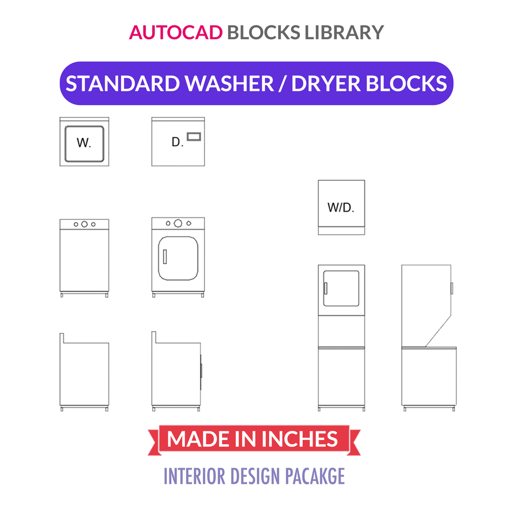 Autocad Standard Washer Dryer Blocks | Plan - Front & Side View